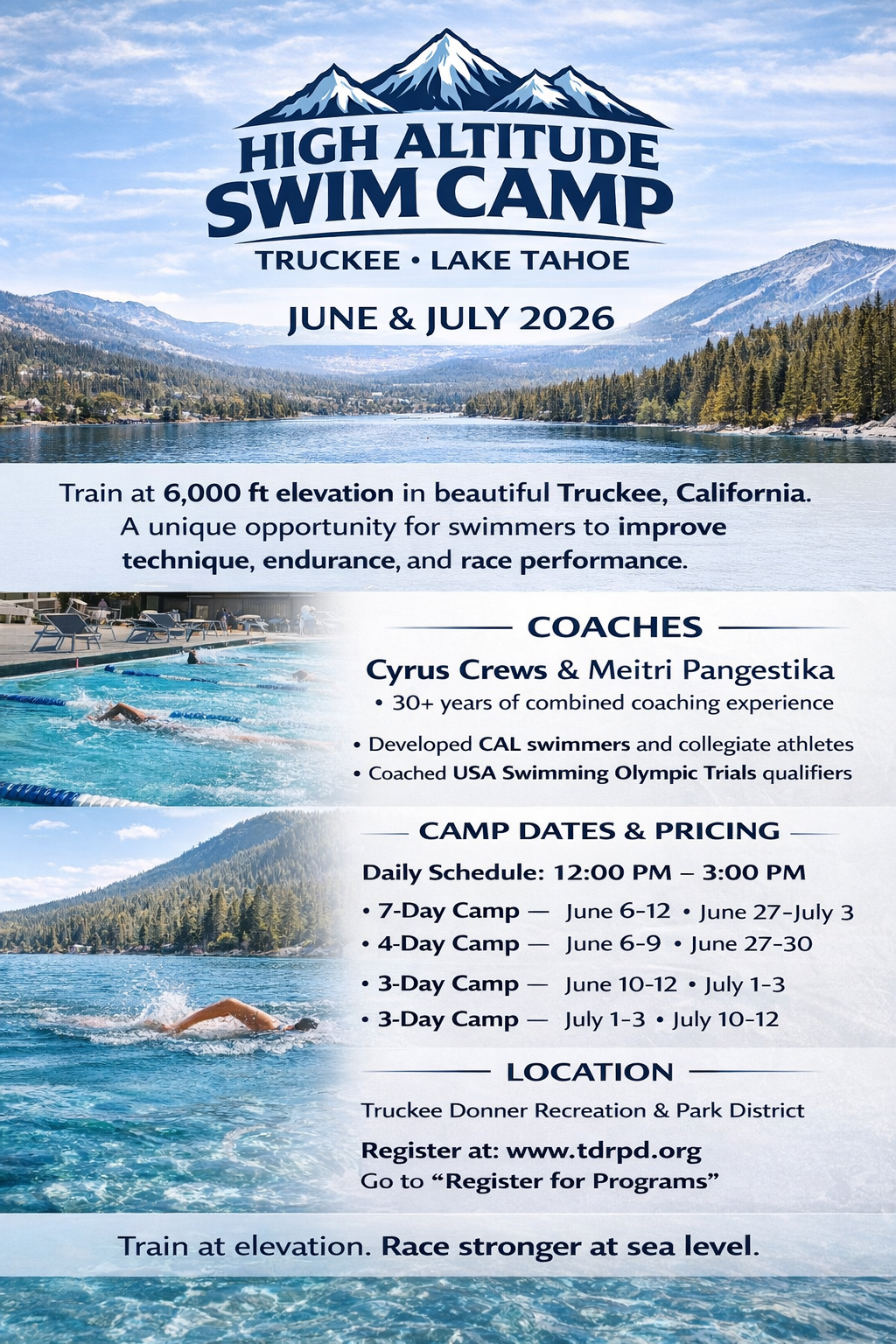 This summer, take your swimming to the next level at the High Altitude Swim Camp in Truckee–Lake Tahoe. Set at over 6,000 feet, this is your chance to gain a competitive edge where elite training meets one of the most breathtaking environments in California.